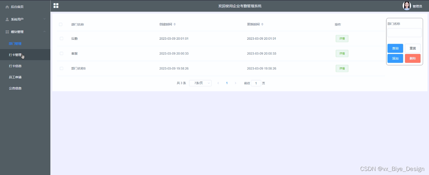 (2)部门管理:点击“部门管理”这个按钮可以查看到系统中所有的部门信息,支持通过部门名称进行查询部门,如果想要添加新的部门信息,点击“添加”按钮然后根据提示输入部门信息,点击“提交”后,在部门界面就会显示新增的部门信息,可以点击某一部门查看部门管理信息的详情,也可以直接点击“删除”进行删除部门信息;