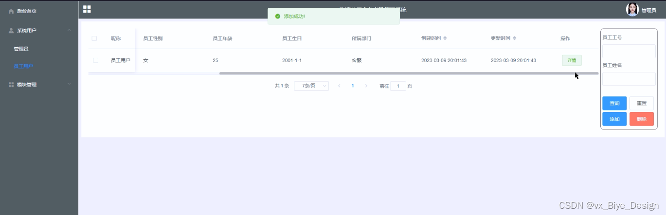 (1)系统用户:管理员可以对系统中所有的用户角色进行管控,包含了管理员以及员工用户这两种角色,如果需要添加新的用户,点击页面中的“添加”按钮根据提示输入上用户信息,点击“提交”以后在对应的用户界面就可以查看到了,可以点击用户后面的“删除”按钮直接删除某一用户。