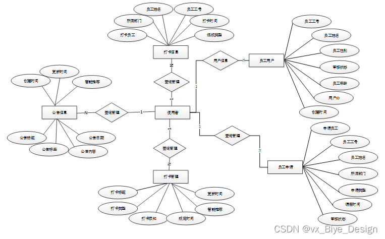 下面是整个企业考勤管理系统中主要的数据库表总E-R实体关系图。