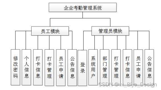 系功能模块的设计就是把系统具体要实现哪些功能,功能如何划分做一个系统的架构,以模块图的方式展示出来,方便我们进行功能得罗列以及涉及。在系统的功能方面,项目分成了管理员+员工用户两个模块,每个模块登录进去对应相应的功能,具体的功能模块图如图3.1所示。