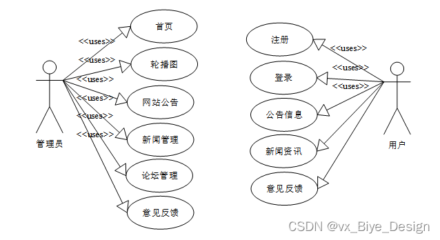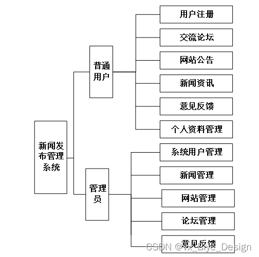 新闻发布管理系统的功能主要分为前台用户根据自己的需求进行注册登录,浏览新闻信息并对选中的新闻进行搜索操作。后台系统管理员因职责的不同,管理员主要对注册用户,新闻数据,意见反馈进行处理。