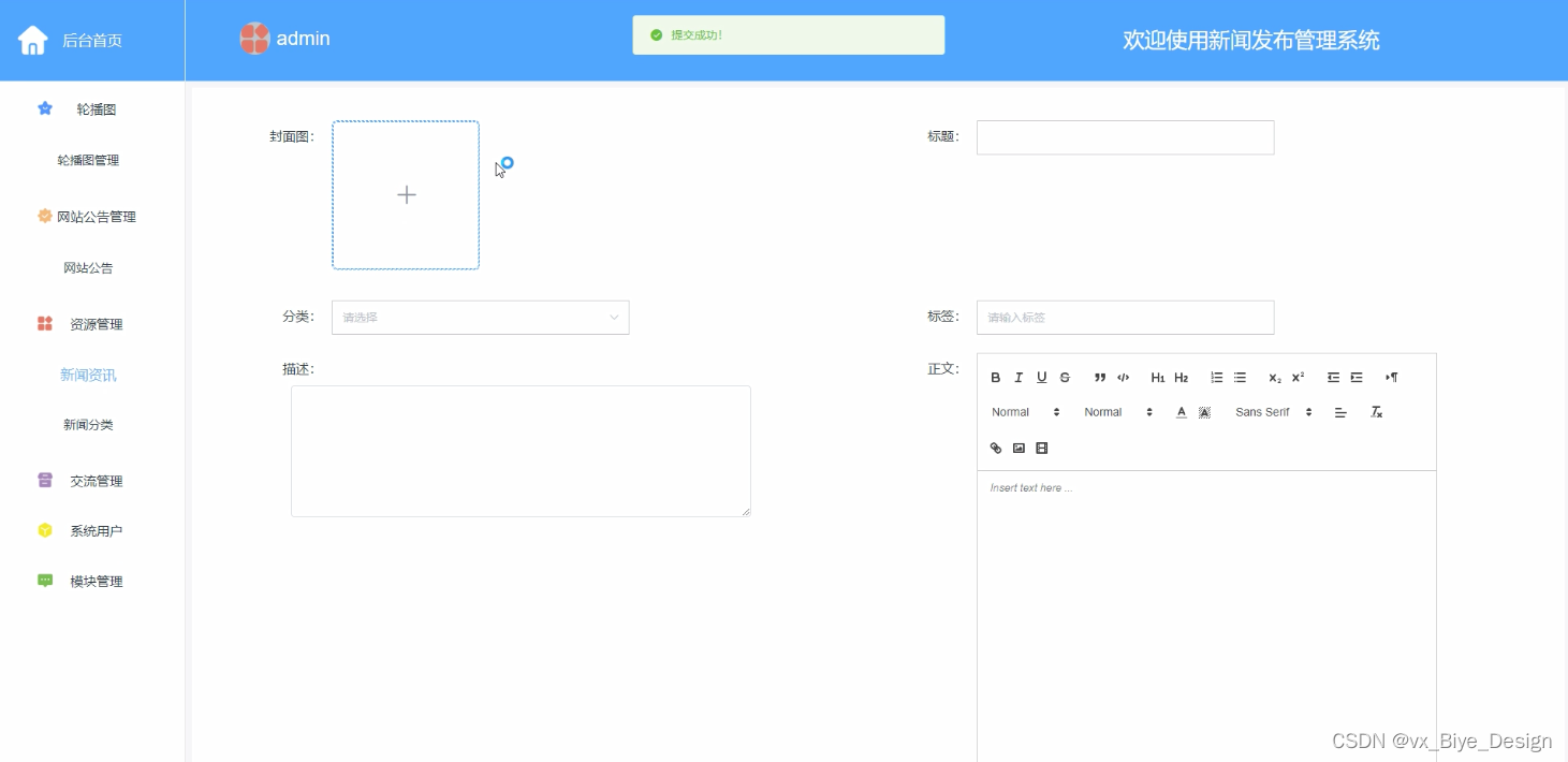 新闻发布管理系统总体分为前台用户模块和后台管理员模块。