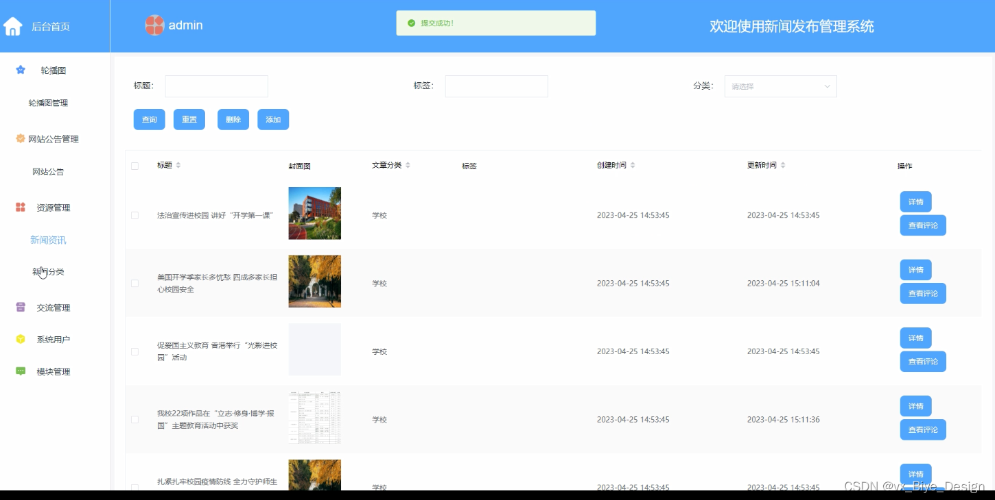 管理员点击左侧菜单“新闻信息管理”,页面跳转到新闻信息管理外观,调用后台新闻查询所有新闻信息。并将信息密封到数据集合List,绑定到请求对象,然后页面跳转到相应的java页面,显示出新闻信息,单击删除按钮完成新闻信息的删除。