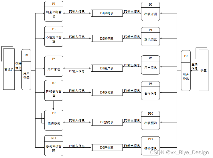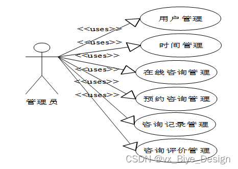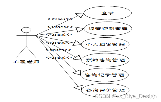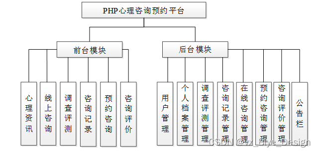 心理咨询预约平台的功能主要分为前台学生根据自己的需求进行注册登录,心理咨询、咨询预约、调查评测等。后台系统管理员因职责的不同,分为心理老师和管理员,心理老师主要对学生提交的咨询预约进行处理,管理员主要对系统用户进行管理。