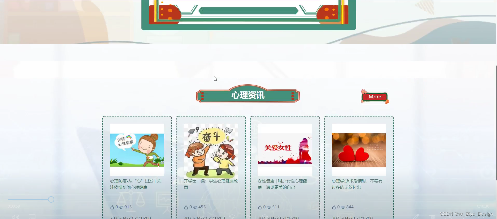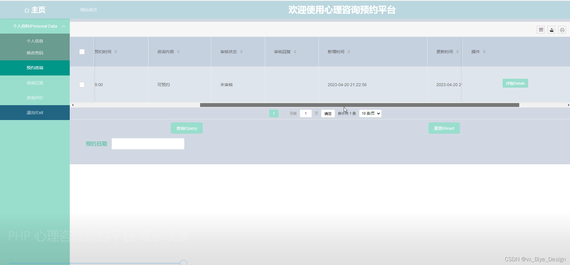 The main functional modules of the psychological consultation appointment platform include survey and evaluation, psychological consultation, online appointment, personal profile, appointment consultation, consultation records, consultation evaluation, etc. The front-end view interface of this system design is selected as a mini program to complete. The system functional design adopts MySQL as the main storage unit for backend data, and the Thinkphp framework is used for system development, achieving all functions of this system. This report first analyzes the background, role, and significance of the research, laying the foundation for the rationality of the research work. Analyze the various requirements and technical issues of the psychological consultation appointment platform, prove the necessity and technical feasibility of the system, and then provide a basic introduction to the technical software and design ideas required for designing the system. Finally, implement the psychological consultation appointment platform and deploy it for operationt.