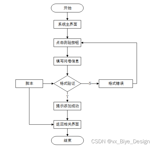 调查评测功能整体流程:用户可以在线进行心理测验题测试,跳转至填写测验信息的页面,填写好问卷信息之后,点击提交按钮,提交成功之后返回提示信息,告知用户测验成功。