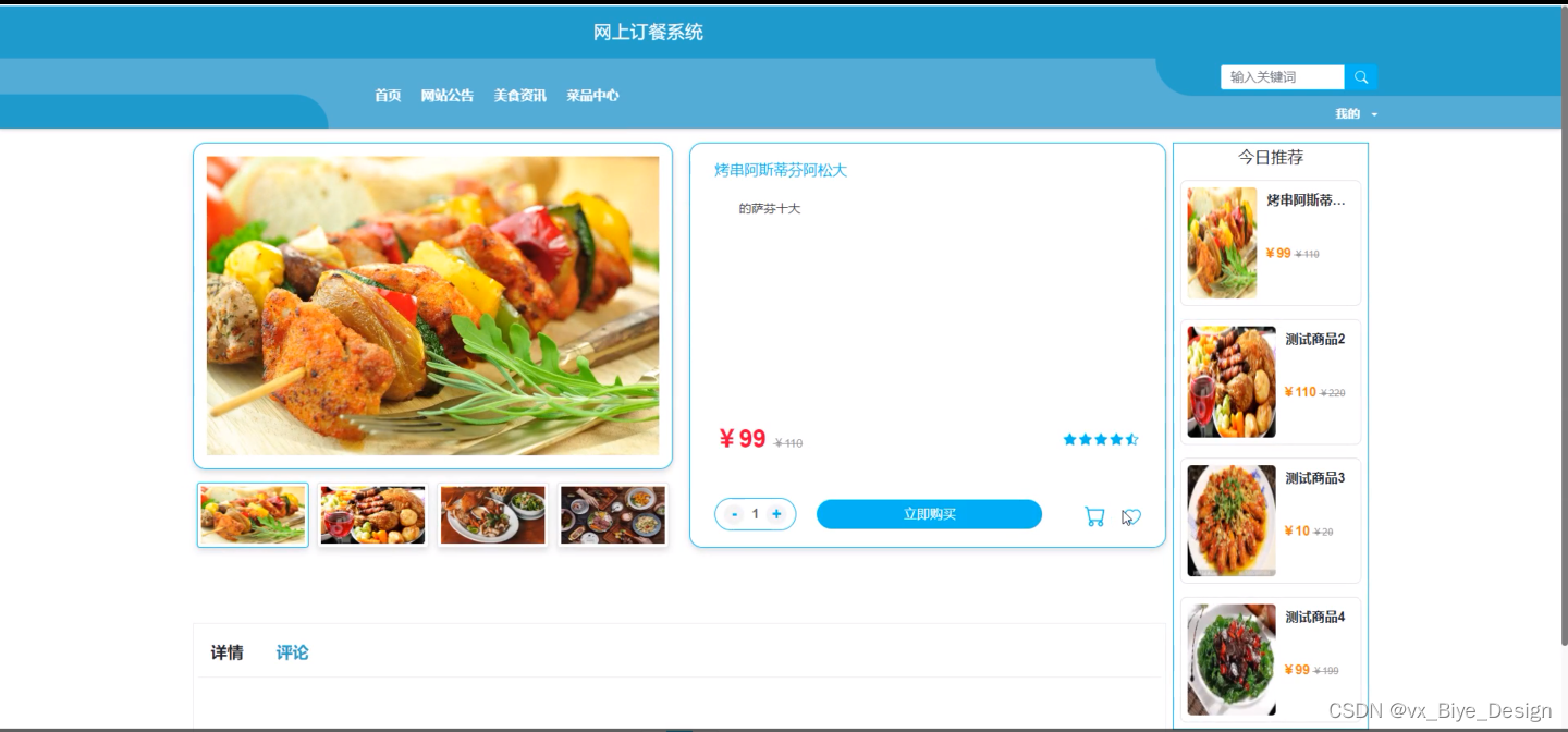 当访客点击了任意菜品后将会进入该款菜品中心的详情界面,可以了解到该菜品的图片信息、分类信息、价钱信息等,同时可以对该菜品中心进行收藏、点赞、加购、购买评论,菜品中心详情展示页面如图5-7所示,购买流程图如图5-8所示。
