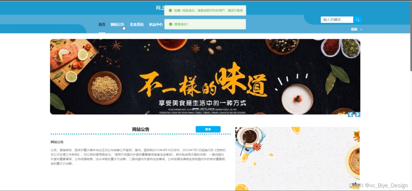 当进入网上订餐系统的时候,首先映入眼帘的是系统的导航栏,导航栏下面是轮播图以及网站公告等,其主界面展示如下图5-1所示。