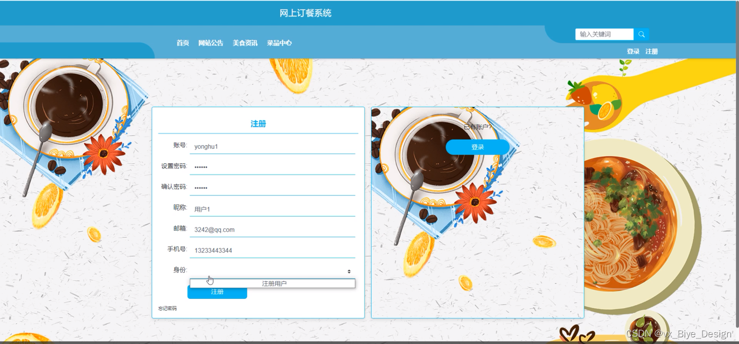 不是网上订餐系统中正式用户的是可以在线进行注册的,当用户点击“注册”按钮,填写上自己的账号+密码+确认密码+昵称等,再点击“注册”按钮后将会先验证输入的有没有空数据,再次验证密码和确认密码是否是一样的,最后验证输入的账户名和数据库表中已经注册的账户名是否重复,只有都验证没问题后即可会员注册成功。其用注册流程图如图5-2所示,注册界面展示如下图5-3所示。