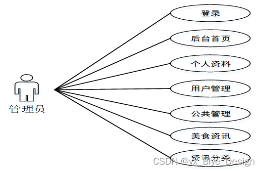 信息管理模块:可分为美食资讯、资讯分类两个模块,管理员对美食资讯有维护的权限。