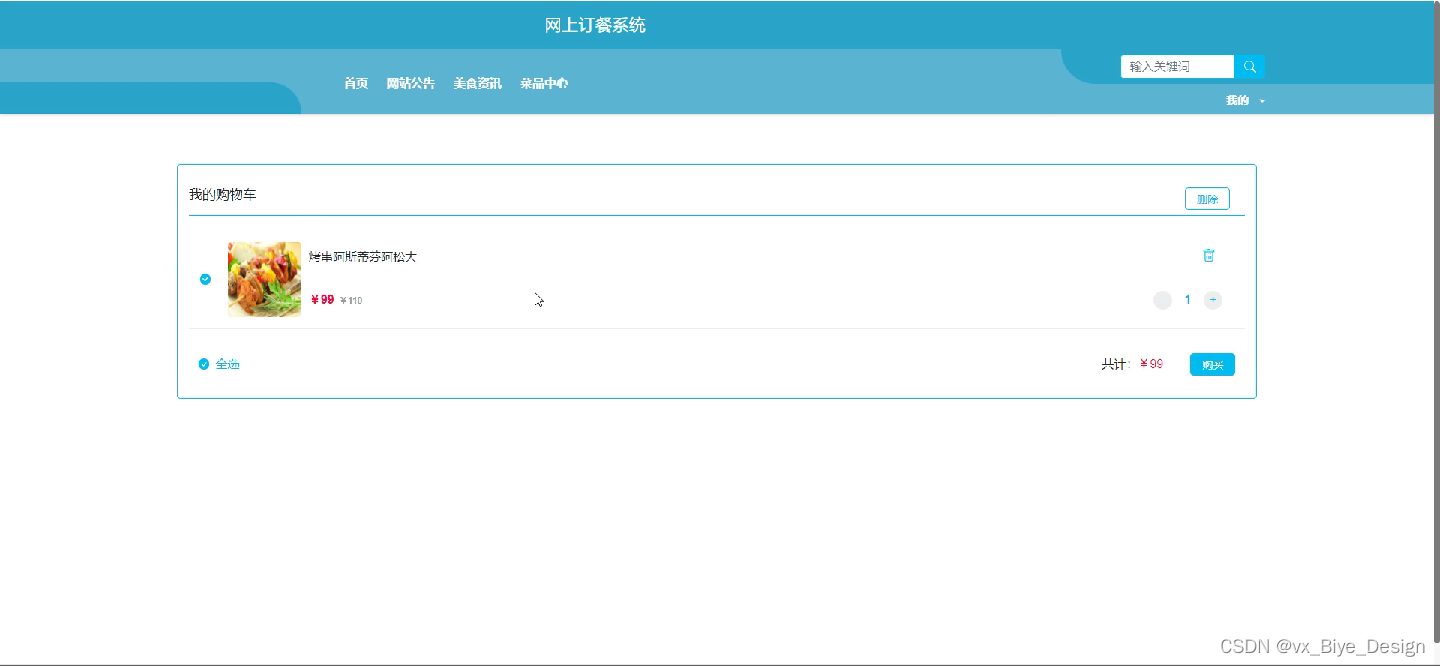 我的购物车:用户可在购物车里面查看自己加购的菜品,可进行付款或删除等操作。