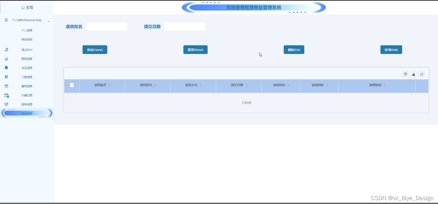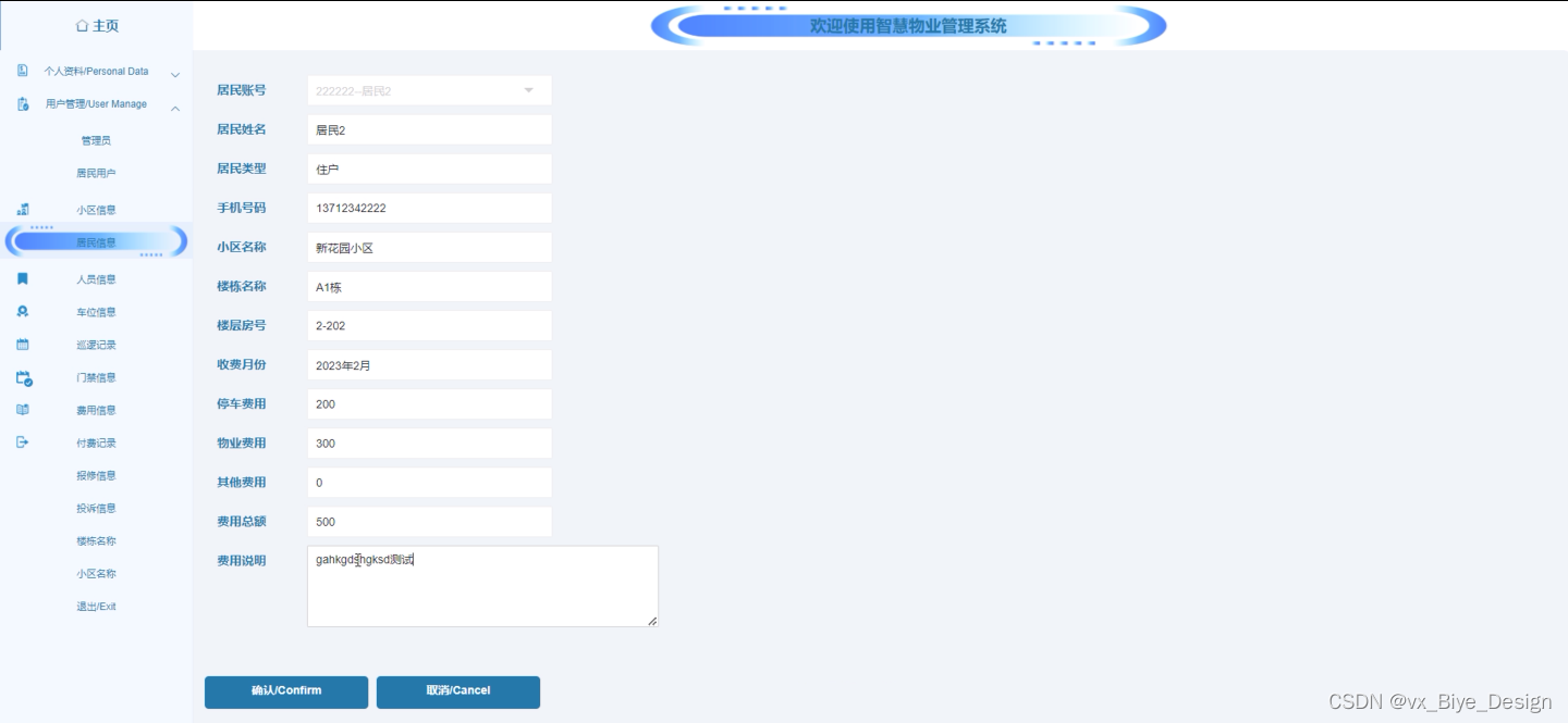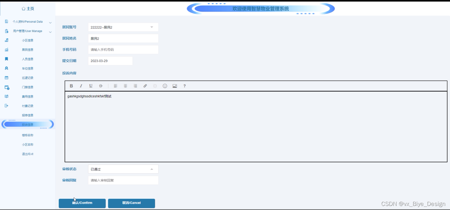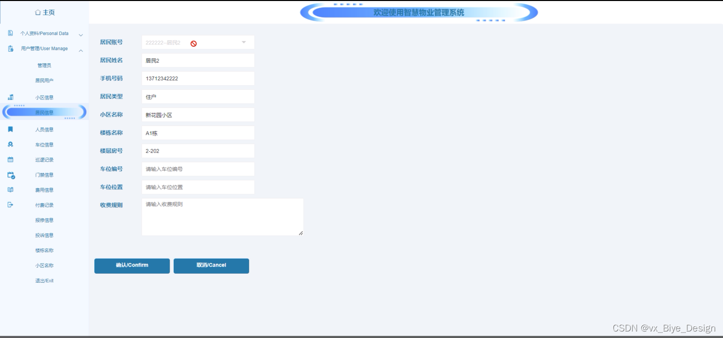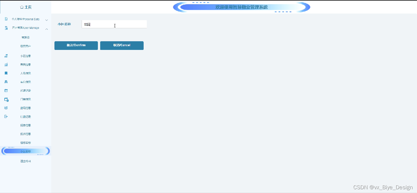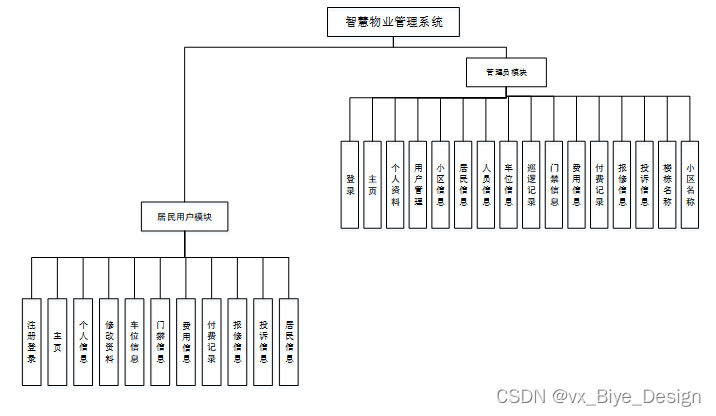 (1)功能要求:可以管理主页,个人资料(个人信息、修改资料)用户管理(管理员、居民用户)小区信息、居民信息、人员信息、车位信息、巡逻记录、门禁信息、费用信息、付费信息、报修信息、投诉信息、楼栋名称、小区名称等系统管理功能。
