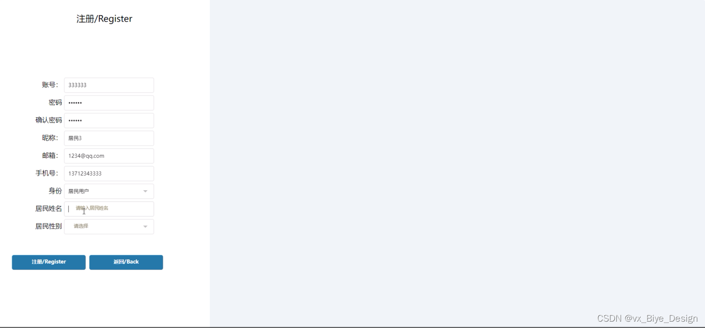 用户注册,通过填写账号、密码、昵称、邮箱、手机号、身份、居民姓名等信息,输入完成后选择登录即可进入智慧物业管理系统,如图5-8所示。
