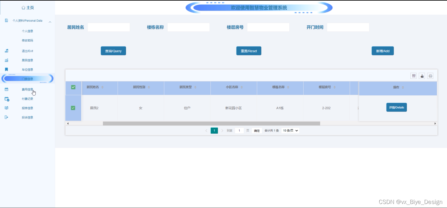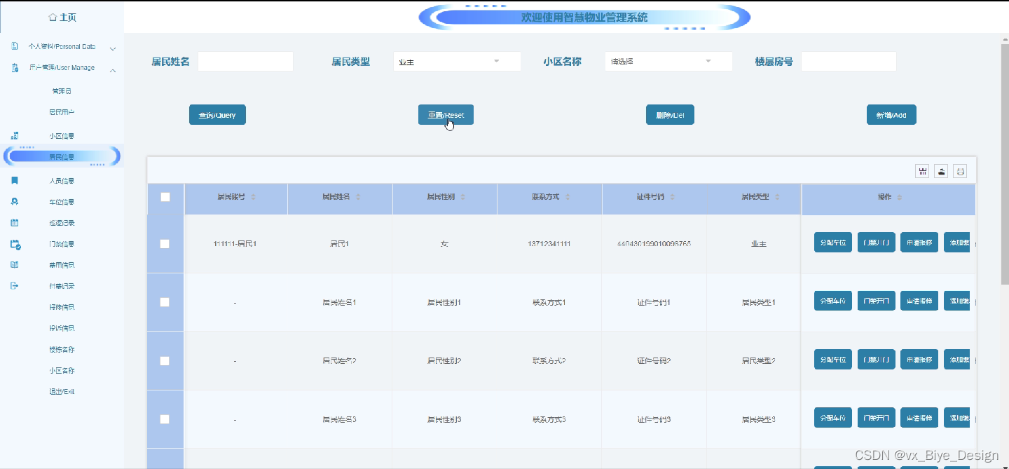 居民信息,管理员在此页面可以查看索引、居民账号、居民姓名、居民姓名、联系方式、证件号码、居民类型、楼栋名称、楼栋房号等详细信息,还可查看分配车位、门禁开门、申请报修、添加微信、详情查看、添加、修改、删除等操作,如图5-5,5-5-1 5-5-2 所示。