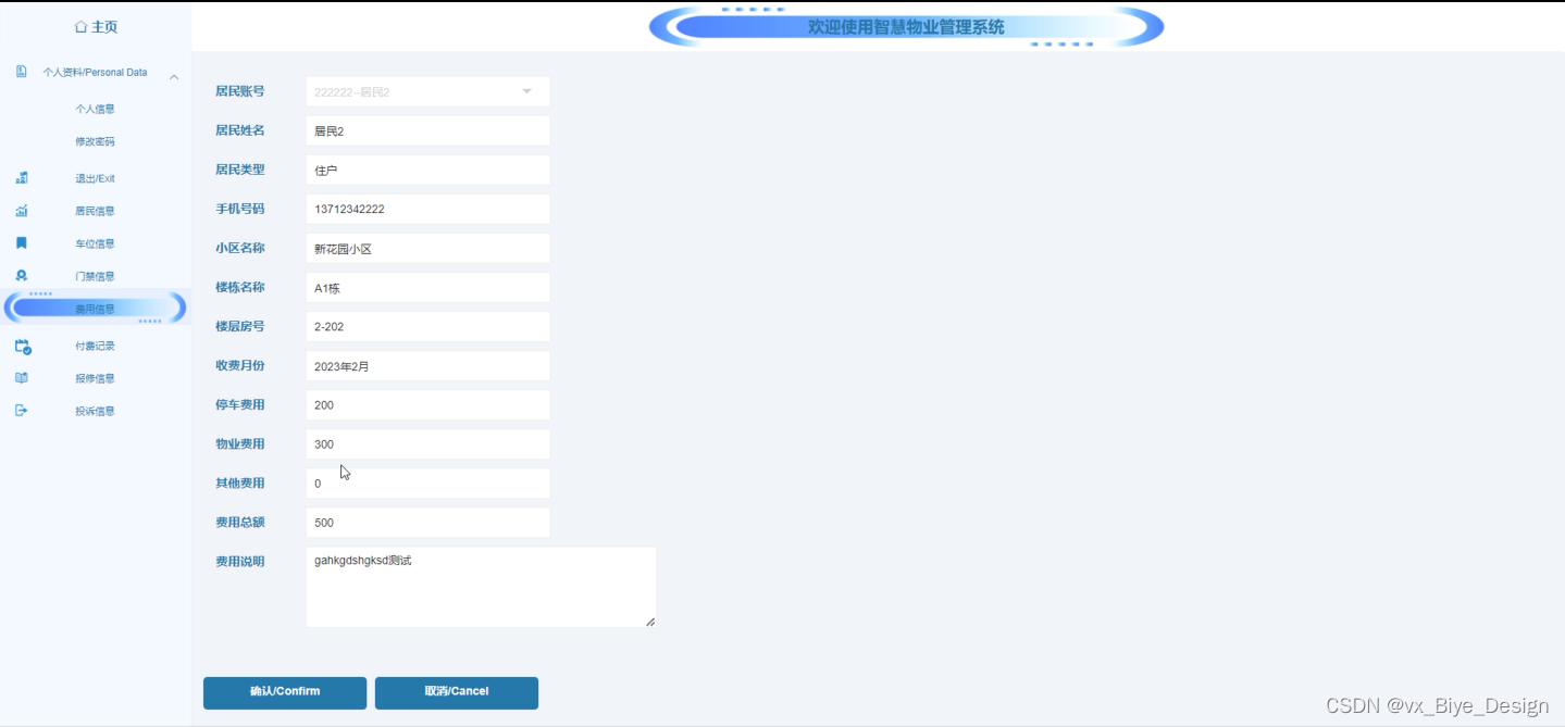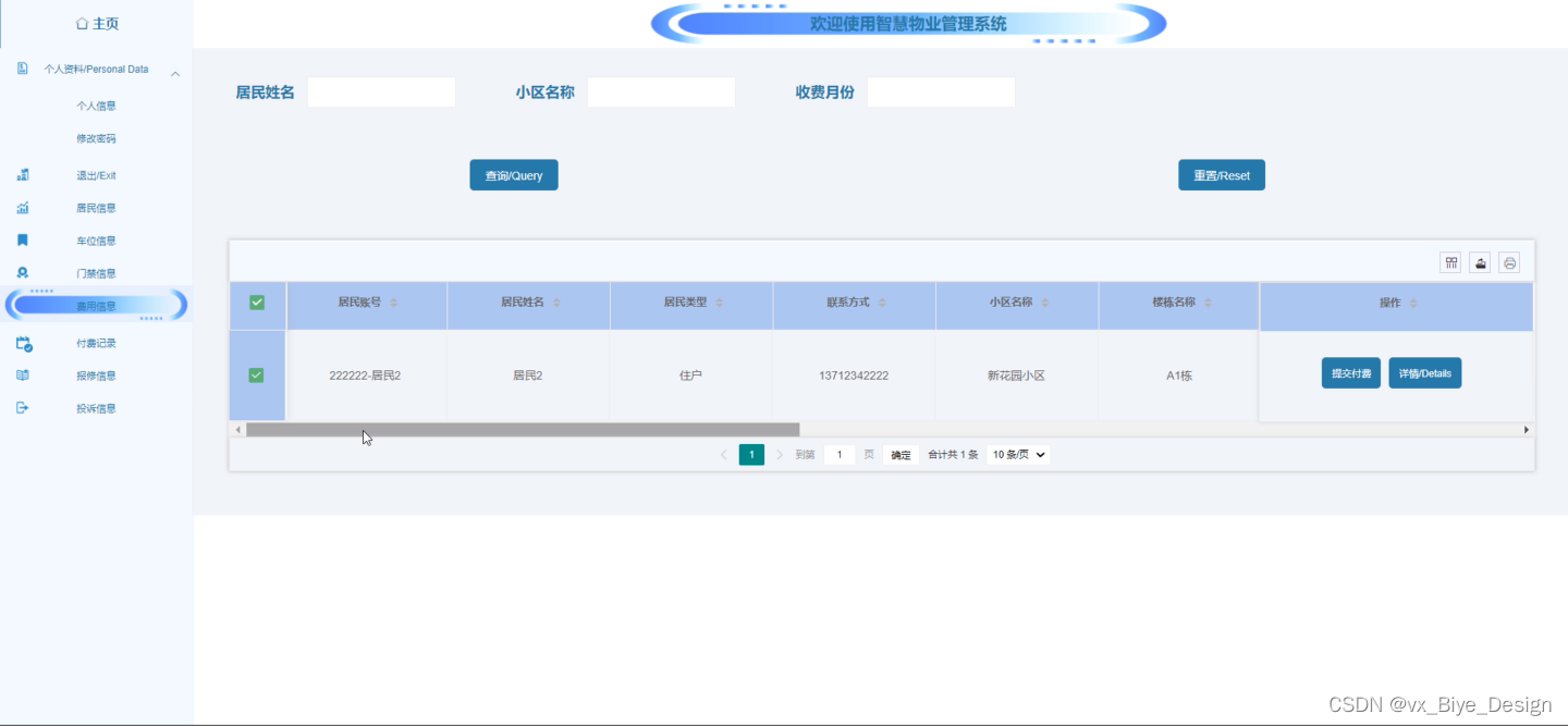 费用信息,居民在此页面可以查看自己的所有的费用信息,可进行提交付费操作,如图5-12 5-12-1所示。
