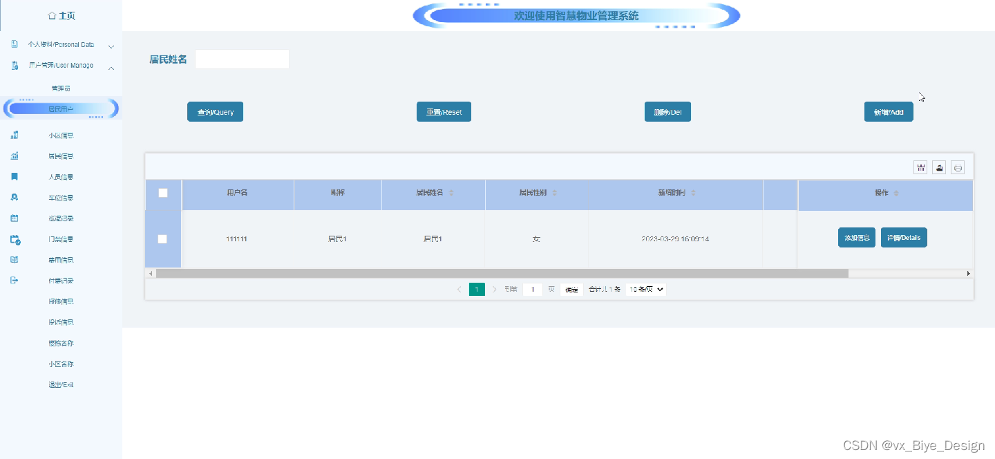 用户管理,在此页面可以查看用户名、昵称、居民性别、居民姓名等信息,并可根据需要对个人信息进行添加,编辑,删除或查看详细内容等操作,如图5-3所示。