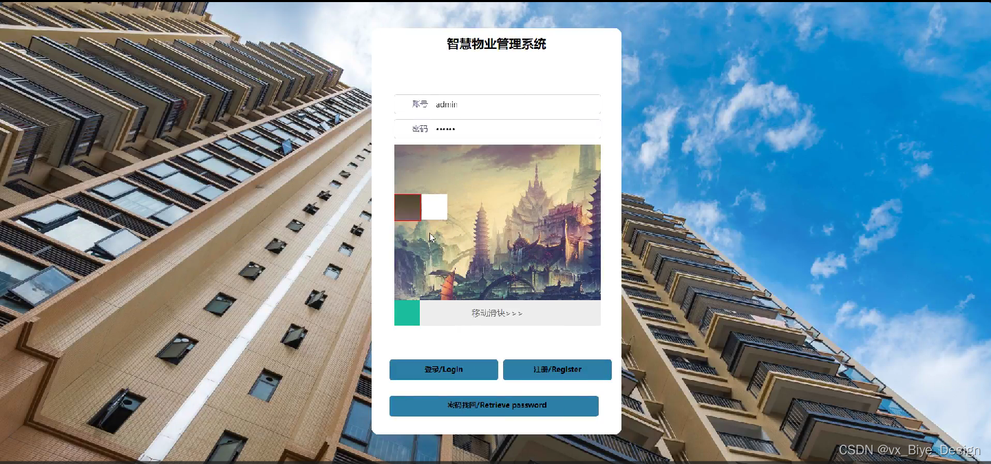 管理员登录,通过填写账号、密码、图片验证,输入完成后选择登录即可进入智慧物业管理系统,如图5-1所示。