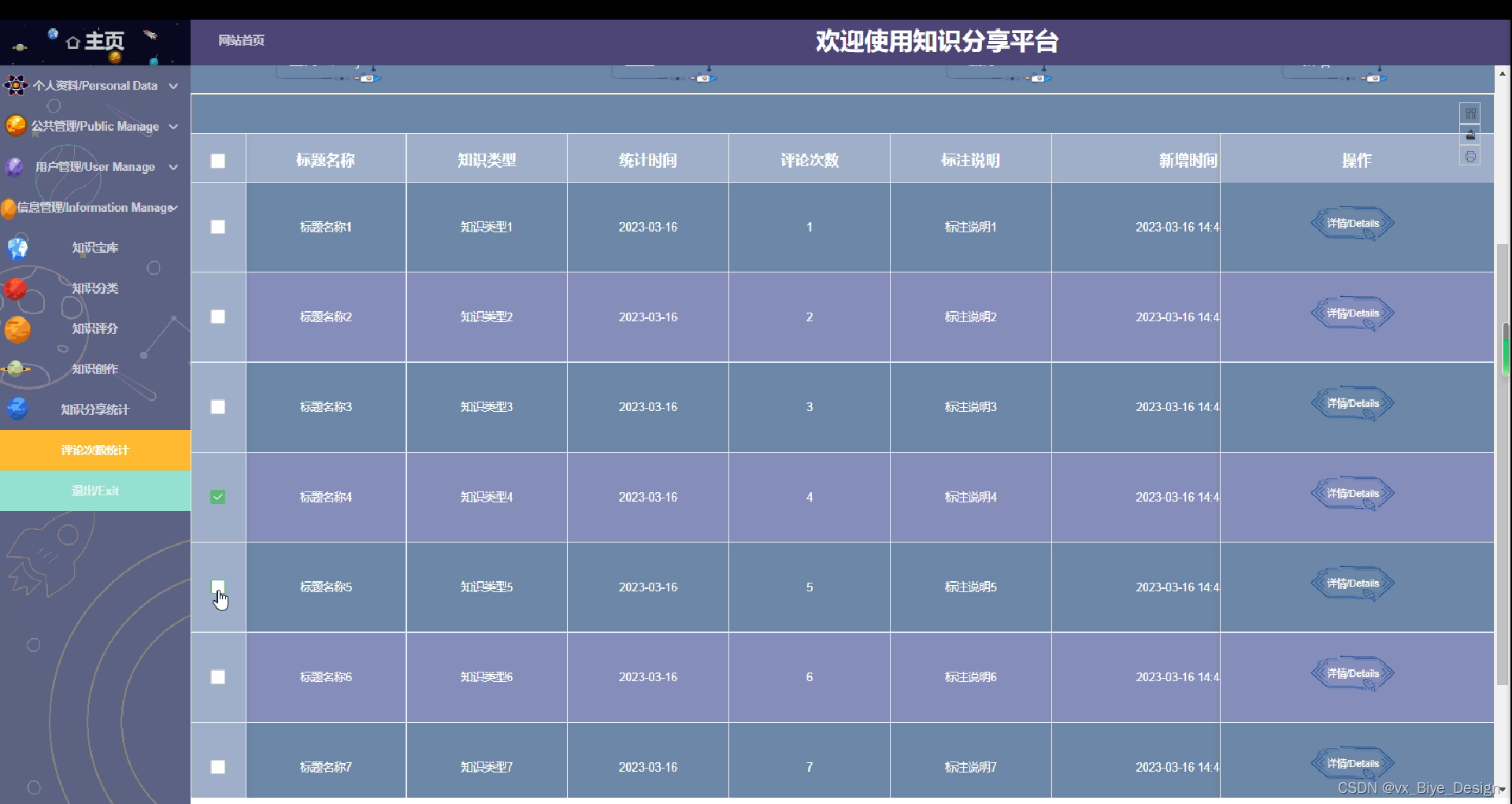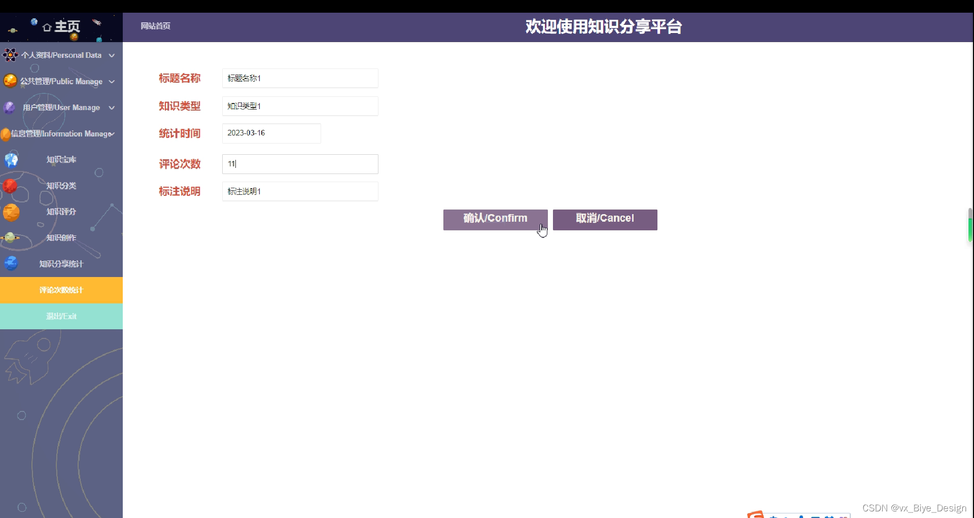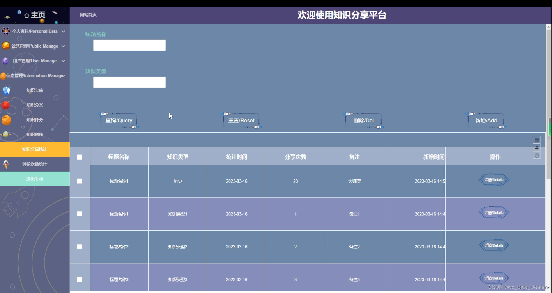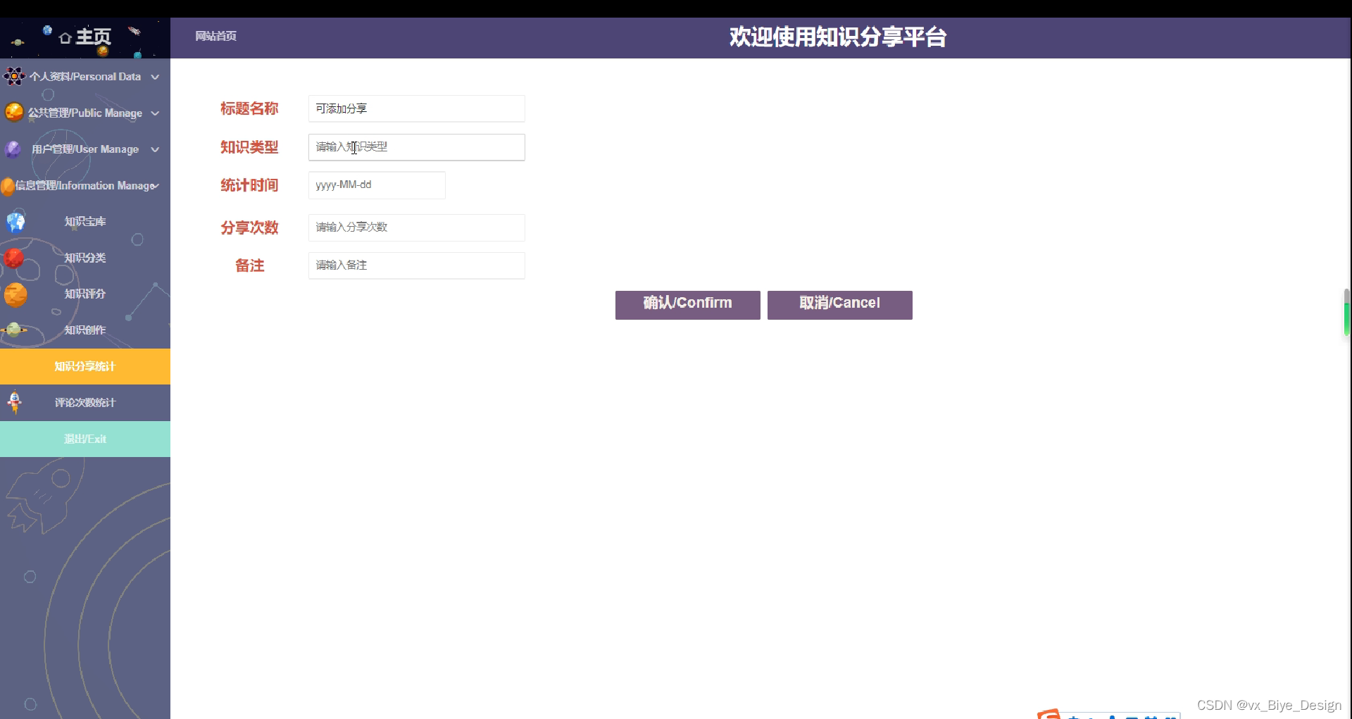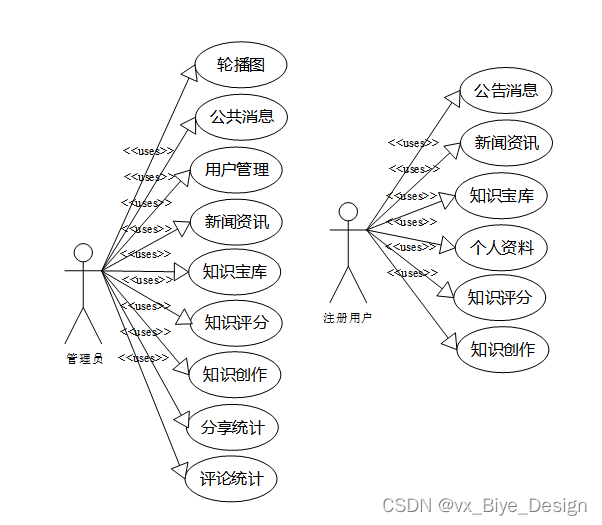 知识分享平台的主要使用者分为管理员,注册用户,实现功能公共管理(轮播图,公共消息),用户管理(管理员,注册用户),信息管理(新闻资讯,资讯分类),知识宝库,知识分类,知识评分,知识创作,知识分享统计,评论次数统计等功能。