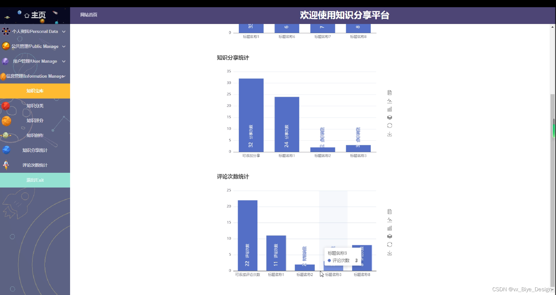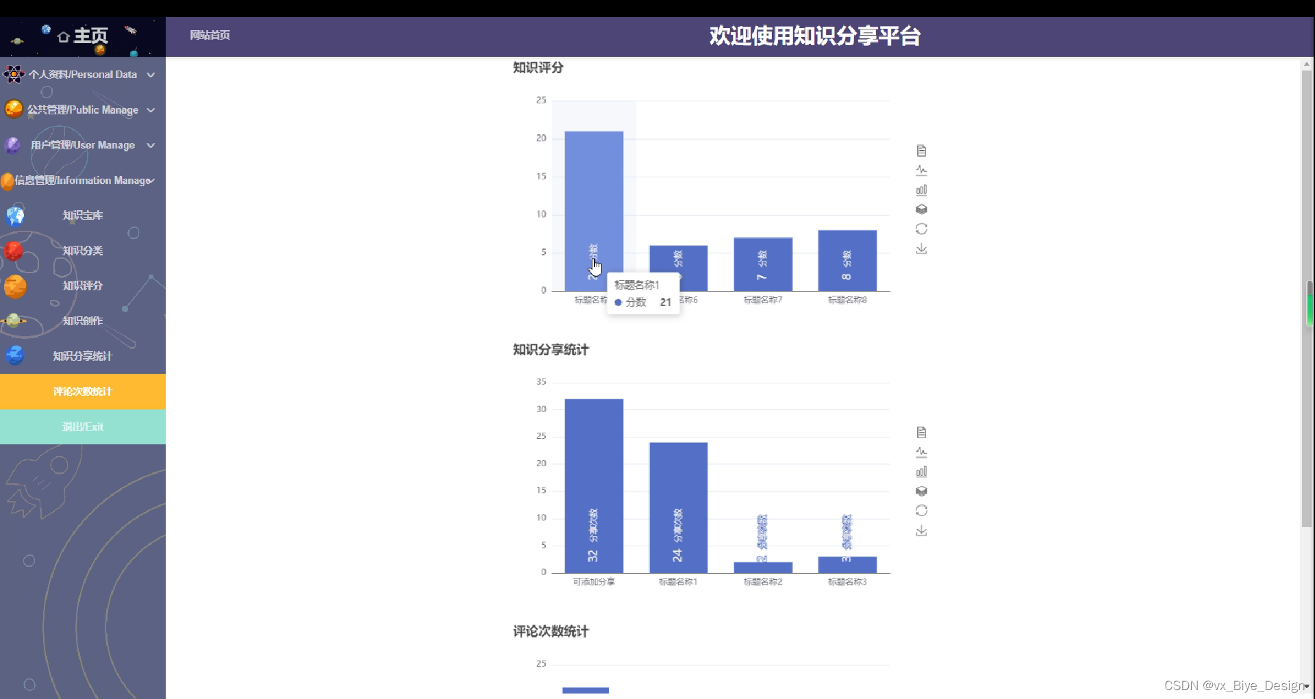 管理员在此页面可以查看每条知识信息被评论的次数,可以进行维护管理,评论统计结果将同步到后台首页中的统计表总。如下图所示。