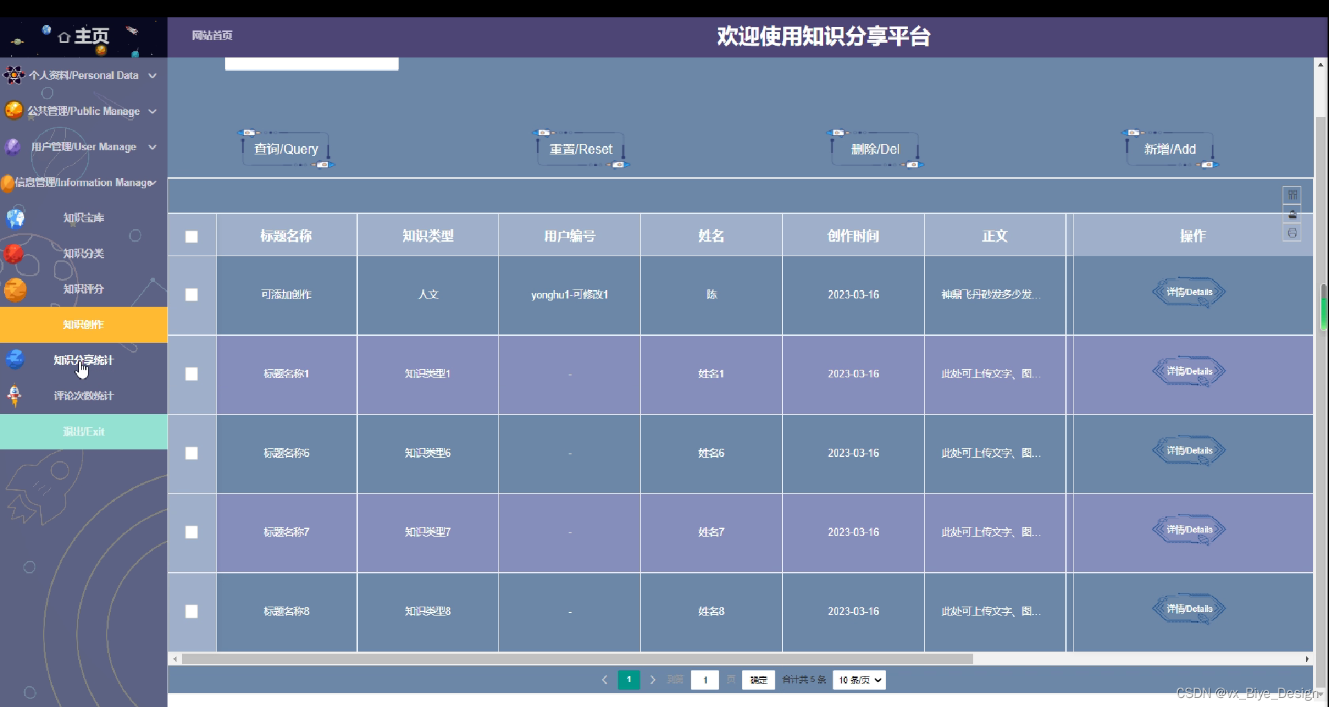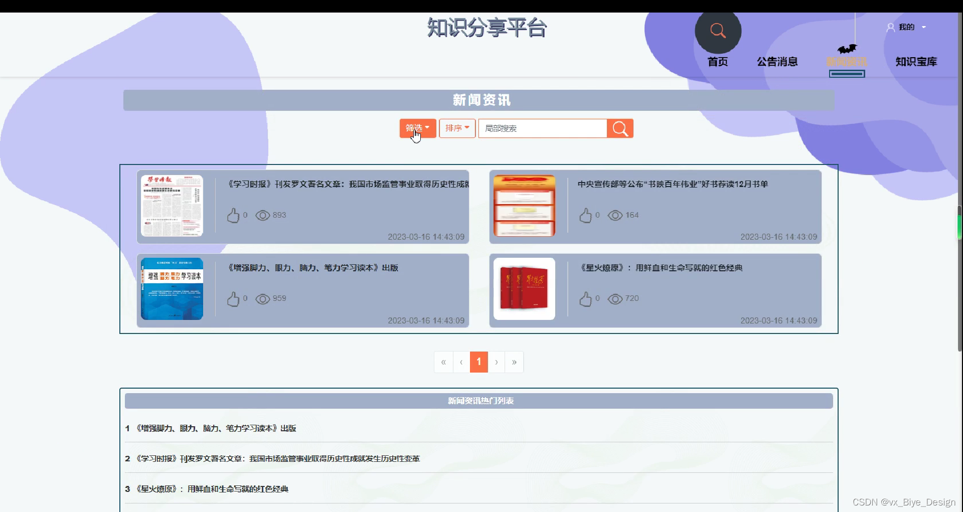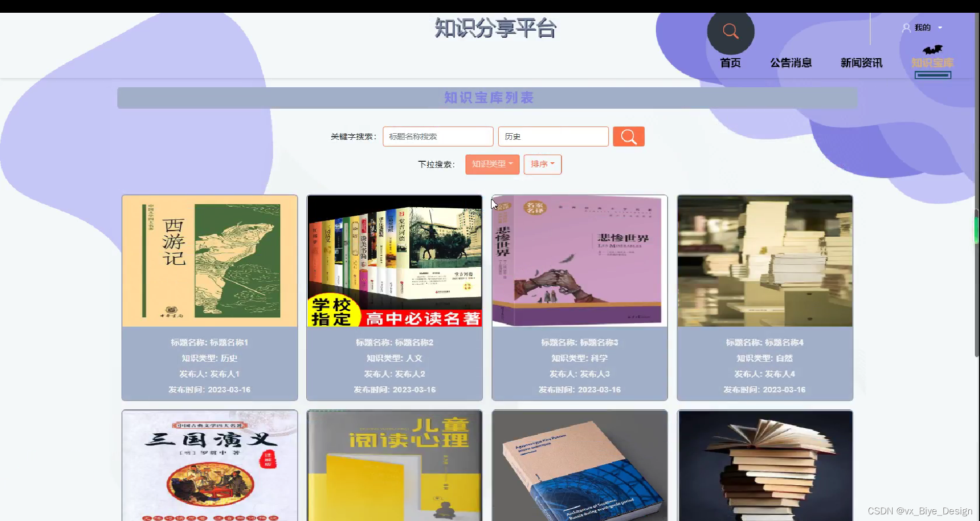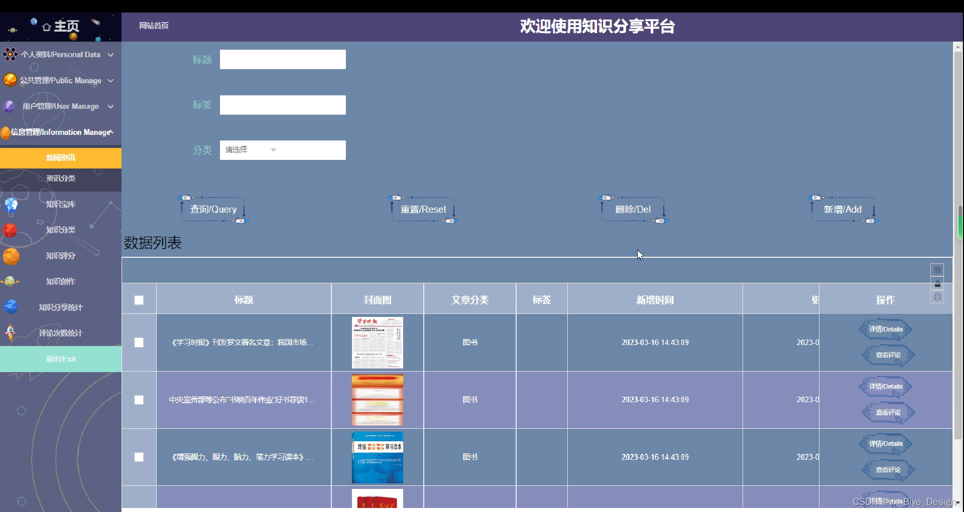 知识宝库:存储平台内的数据。包括标题名称、类型、发布人,发布时间等数据项。