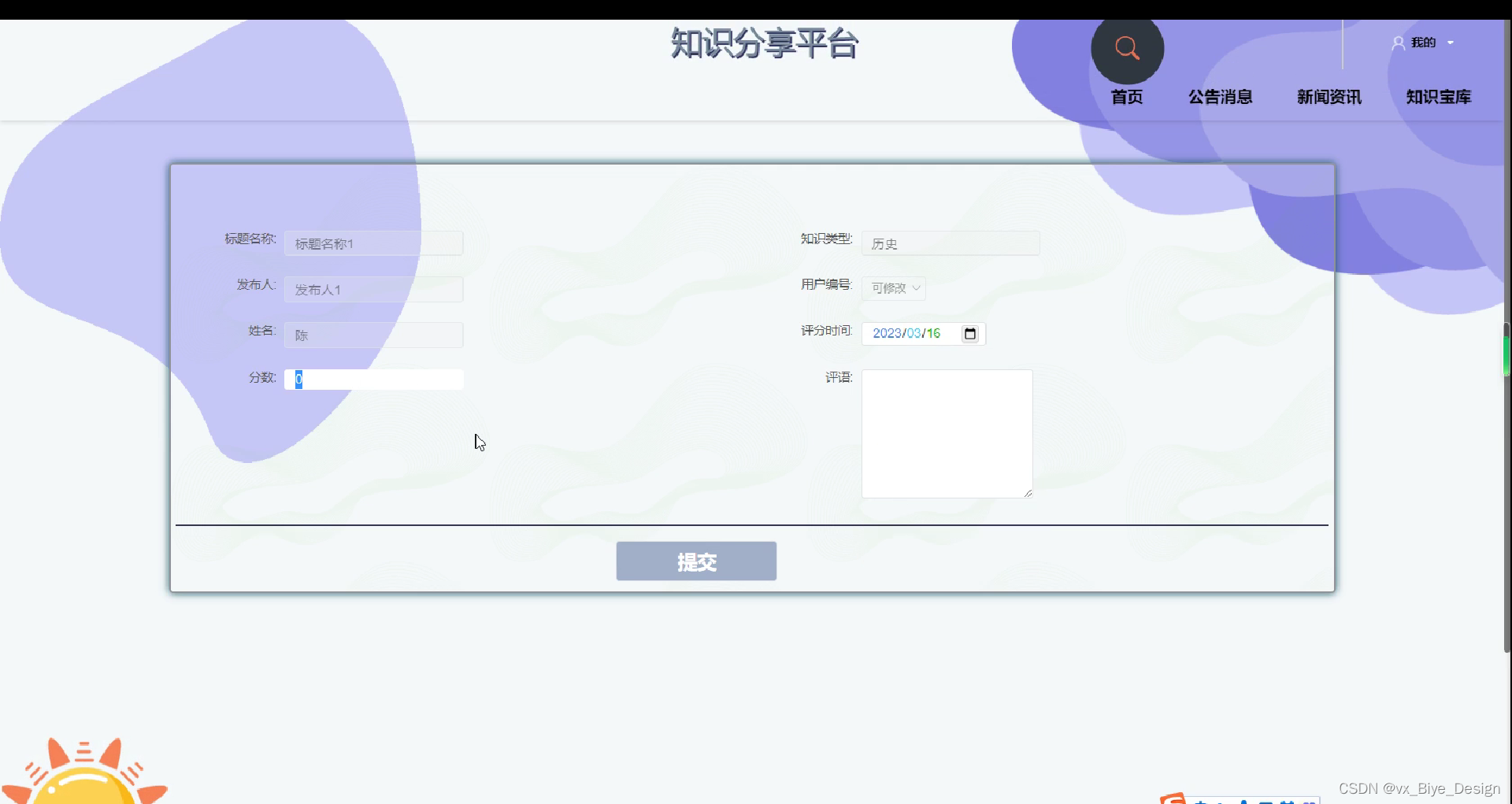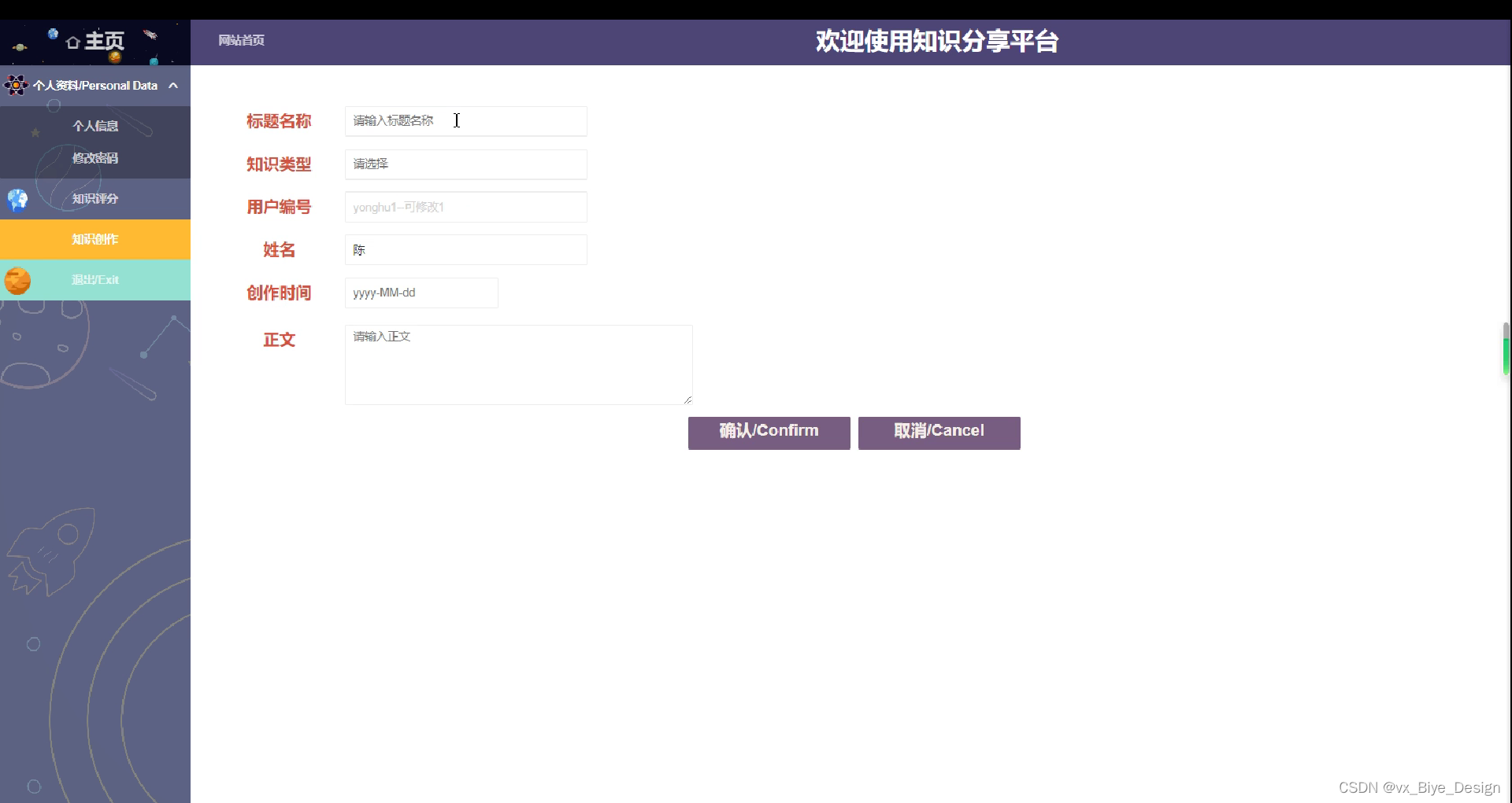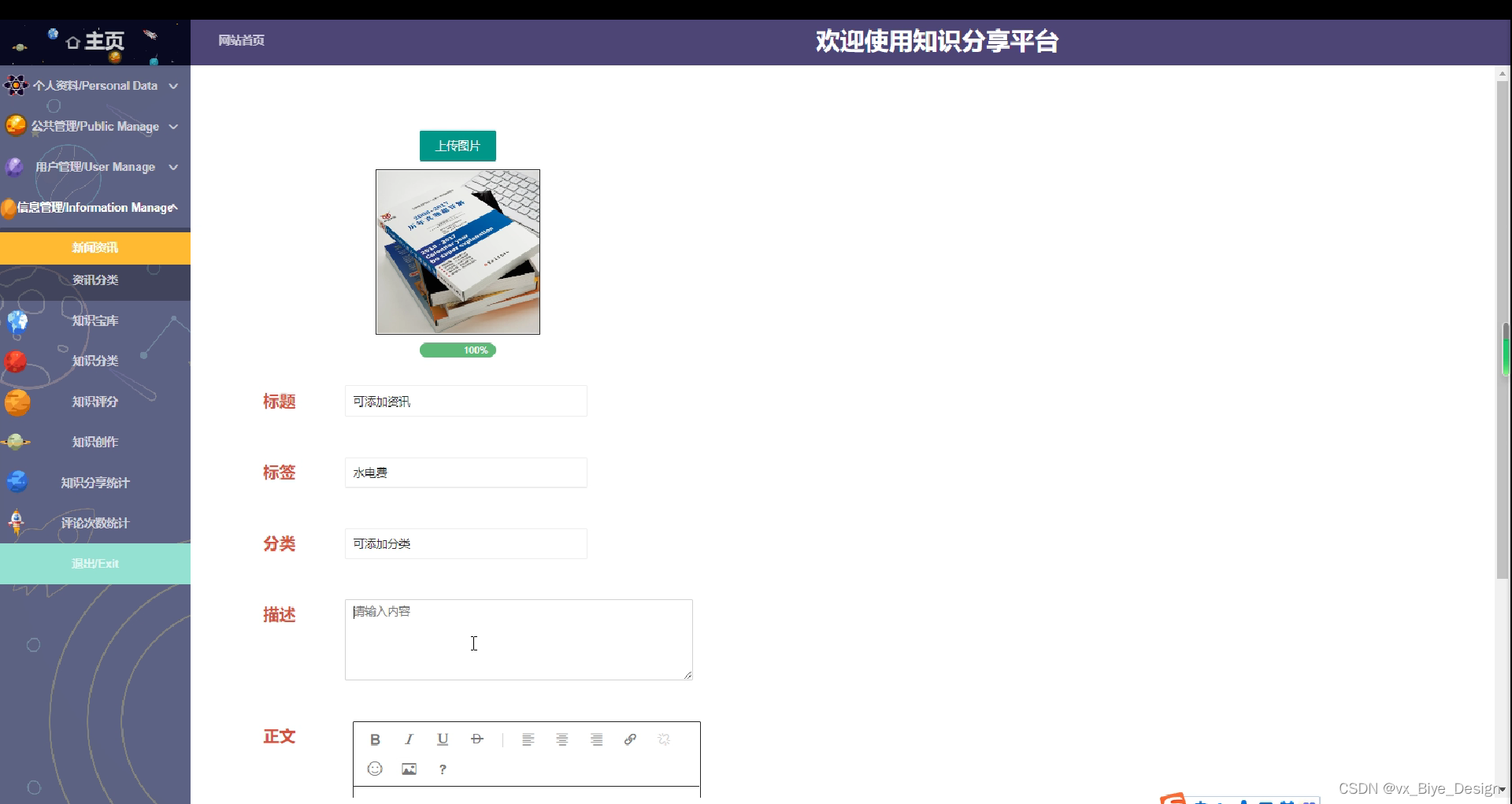 用户在后台知识创作页面, 通过输入标题名称,类型,用户编号,姓名,以及创作内容等发表知识创作。如下图所示。
