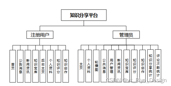 The main users of the knowledge sharing platform are divided into administrators, registered users, public management functions (broadcast charts, public messages), user management (administrators, registered users), information management (news information, information classification), knowledge treasure trove, knowledge classification, knowledge scoring, knowledge creation, knowledge sharing statistics, comment frequency statistics, and other functions.