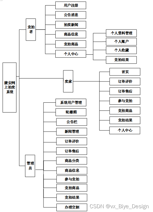 网上拍卖系统总体分为前台用户模块和后台管理员模块。