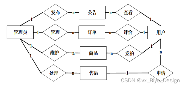 从前面可以分析到数据库中最重要的是商品信息,用户信息,管理员信息,同时存在竞拍信息和发货信息。分析可以得到如下数据描述: