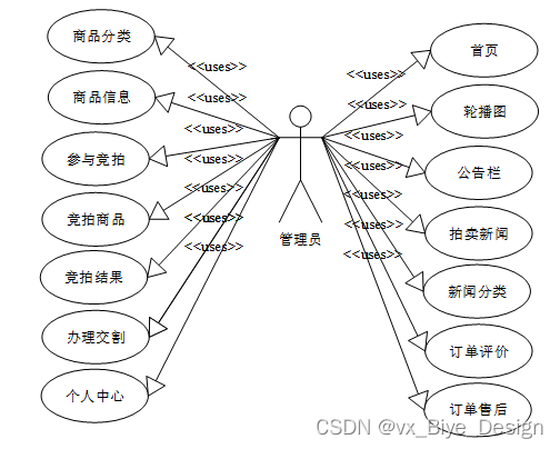 网上拍卖系统的功能主要分为前台用户根据自己的需求进行注册登录,浏览拍卖信息并对选中的商品进行竞拍操作。后台系统管理员、卖家、竞拍者权限不同,卖家主要对竞拍单进行处理,处理订单发货单,而超级管理员主要对注册用户,资讯数据,拍卖详细信息,订单详细信息,订单发货单进行处理。