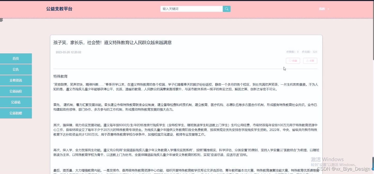 (4)支教资讯:用户可以查看支教资讯信息,在查询到自己想要了解的支教资讯的时候,可以进入查看详细的介绍进行评论、点赞、收藏操作。