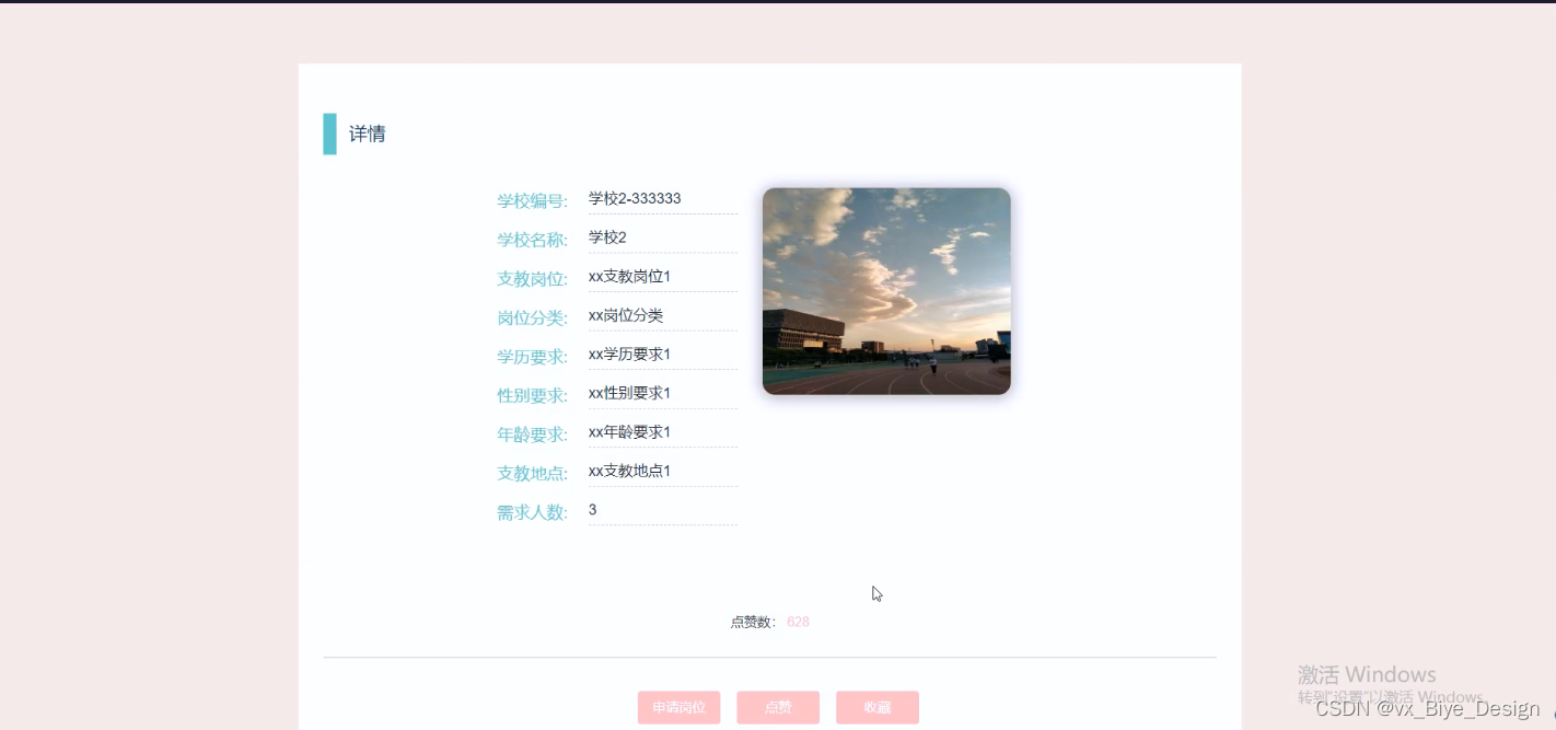 (5)公益岗位:学生可以查看公益岗位,在查询到自己想要了解的公益岗位的时候,可以进入查看详细的介绍,点击“申请岗位”这一按钮以后会跳转到岗位申请信息填写的界面,根据提示填写好申请岗位的信息,点击“提交”以后申请岗位就完成了,在公益岗位详情这个界面,同时支持用户对喜欢的公益岗位进行收藏、点赞的功能。