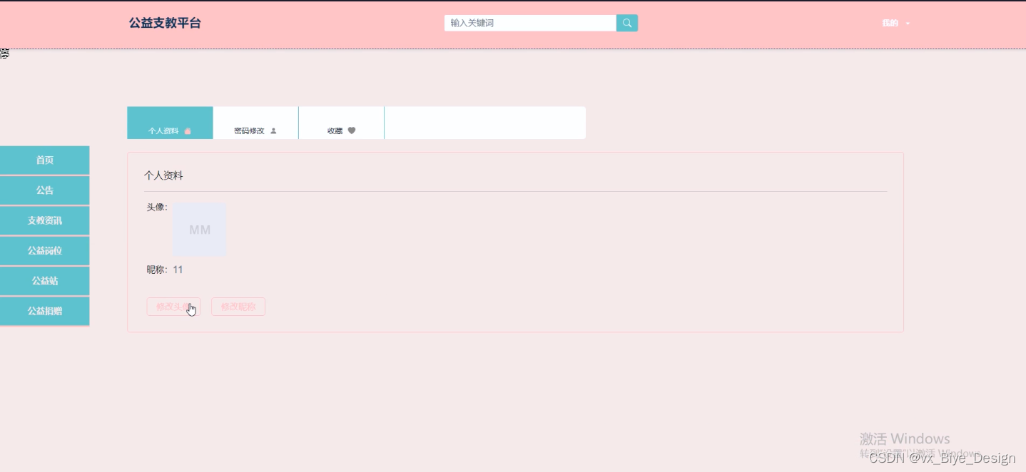 (2)查看公益支教平台的首页信息:公益支教平台的首页信息包含了首页、留规格、支教资讯、公益岗位、公益站、公益捐赠、我的(我的账户、我的收藏、个人中心)。