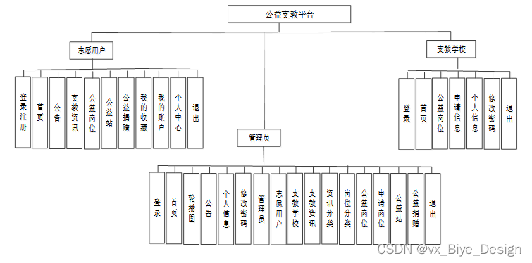 公益支教平台划分为了志愿用户模块、支教学校模块和管理员模块这三大部分。