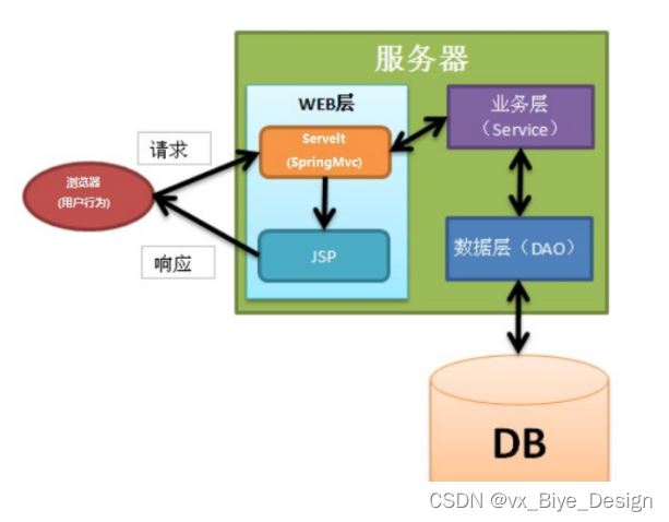 页面发送请求给控制器,控制器调用业务层处理逻辑,逻辑层向持久层发送请求,持久层与数据库交互,后将结果返回给业务层,业务层将处理逻辑发送给控制器,控制器再调用视图展现数据。