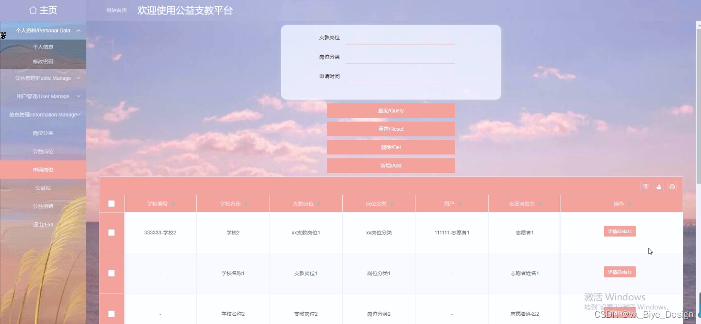 (4)申请岗位:管理员点击“申请岗位”会显示出所有的申请岗位信息,支持通过申请岗位状态或者输入支教岗位或者申请时间对申请岗位信息进行查询,如果想要添加新的申请岗位信息,点击“添加”按钮,输入相关信息,点击“提交”按钮就可以添加了,同时可以选择某一条申请岗位信息,点击“删除”进行删除。