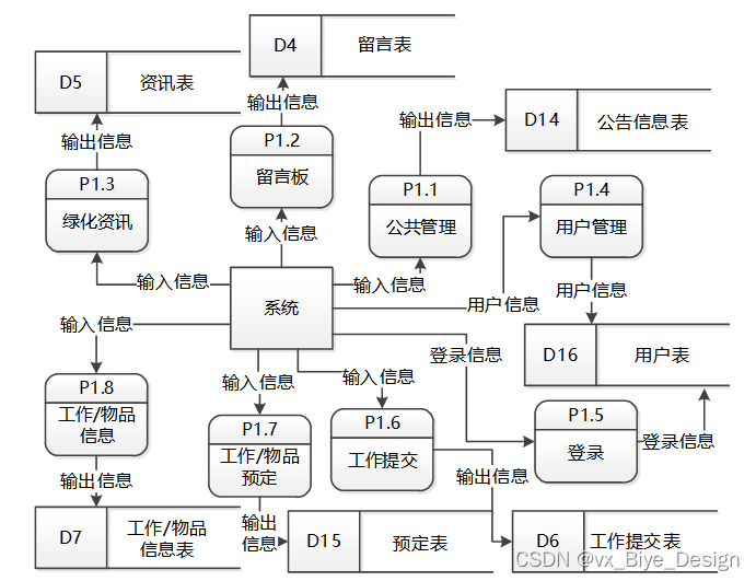 二层数据流程是对一层数据流层图中填写登录信息、用户功能的细化。即:用户管理,信息管理,工作信息,工作预定,工作提交,物品信息,物品预定,清点记录查询等操作。