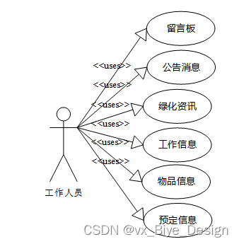 系统设计的目的是分析系统包括的所有功能结构,为开发人员设计开发和实现系统做好准备工作。经过前期的需求调查、分析和整理之后,确定的总体需求主要包括多个模块,分别是:公共管理(轮播图,公告消息),用户管理(管理员,工作人员),信息管理(留言板,留言分类,绿化资讯,资讯分类),工作信息,工作预定,工作提交,物品信息,物品预定)等。系统整体角色分为两个部分,一是工作人员、二是管理员。权限分布也是很明显,工作人员是在除去浏览信息之外还具有查询和管理自己账户信息,工作信息,物品信息,工作预定,工作提交,物品预定,清点记录等权限;管理员是最高权限拥有者。