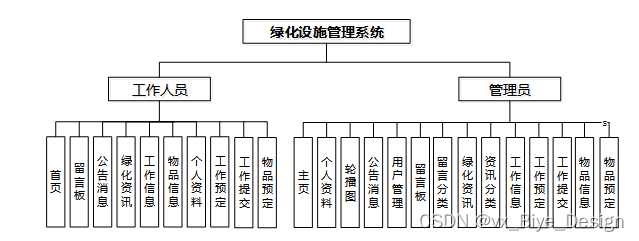 绿化设施管理系统在对需求做解析后,整个系统主要分为两个部分:管理员和工作人员,每个模块下的分支功能不一样。对功能做出如下说明: