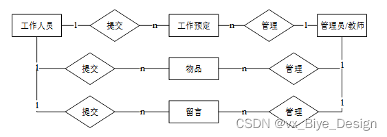 工作人员和工作信息存在申请关系,关系为一对多,根据工作编号来将工作数据传入到预定数据中,操作人为工作人员,然后生成预定列表,工作人员查看个人历史领取列表,可以进行数据销毁。