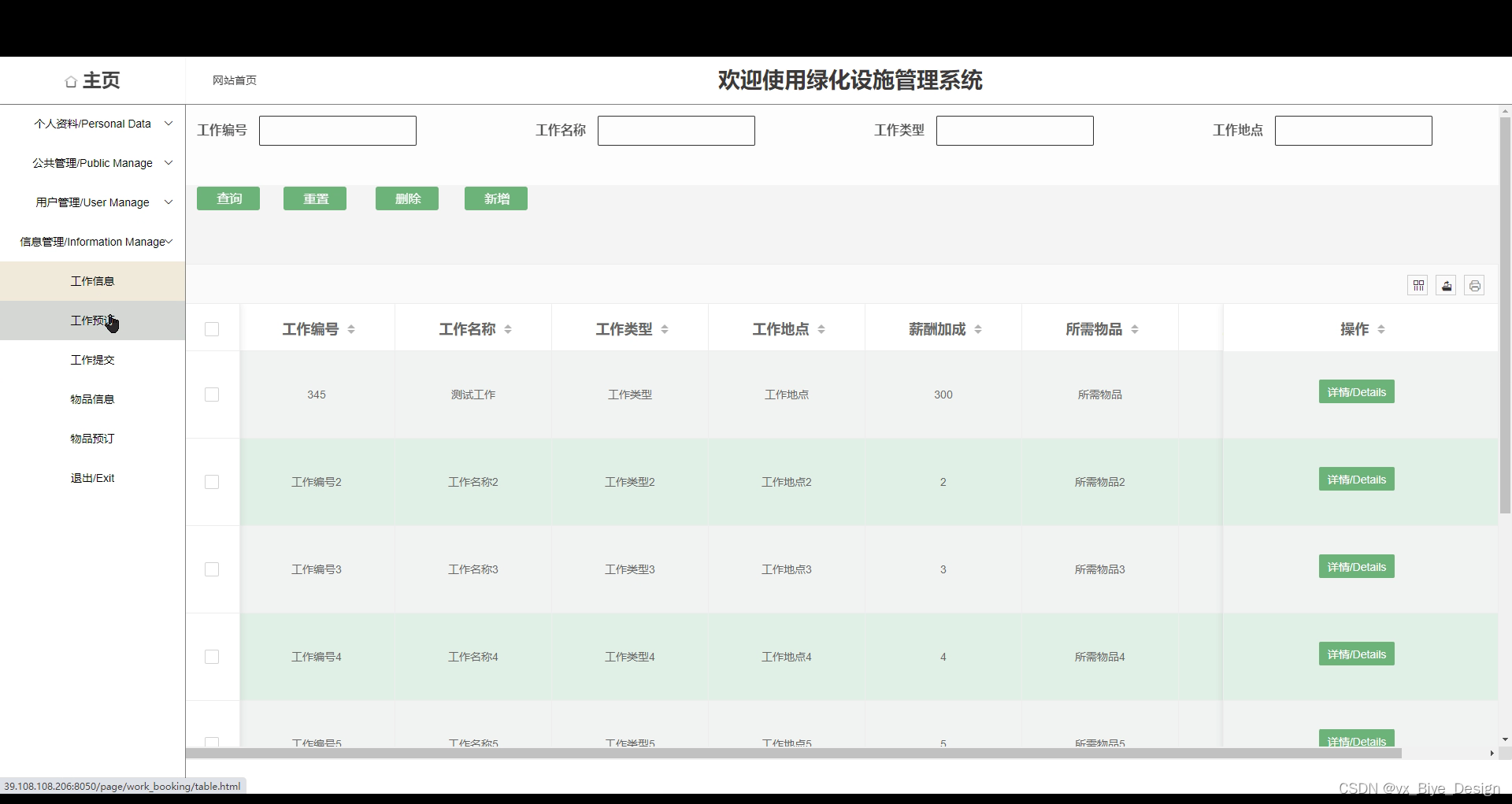 管理员在此页面可以查看工作编号,名称,类型,地点,薪酬等工作详细信息。可以进行查询,重置,删除,新增等操作。如下所示。