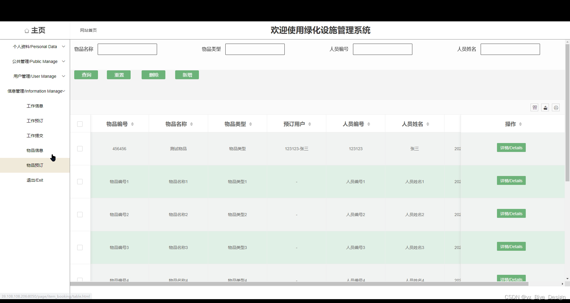 管理员在此页面可以查看物品编号,名称,类型,预定用户,人员编号等物品详细信息。可以进行查询,重置,删除,新增等操作。如下所示。
