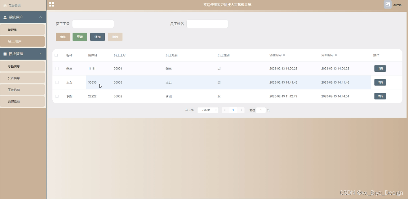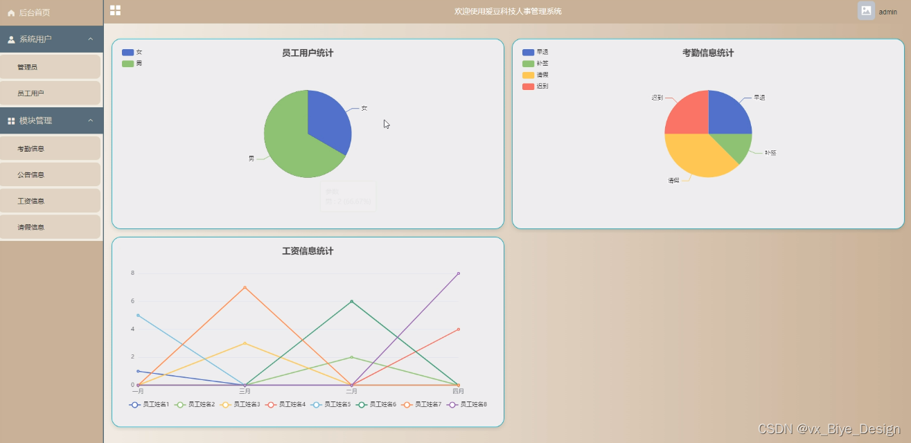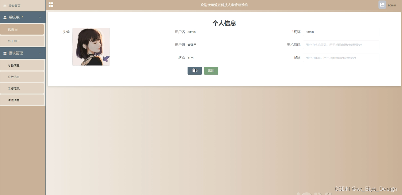 管理员登录进入爱豆科技人事管理系统 可以查看首页、系统用户(管理员、员工用户)、模块管理(考勤信息、公告信息、工资信息、请假信息)等内容,如图5-3所示。