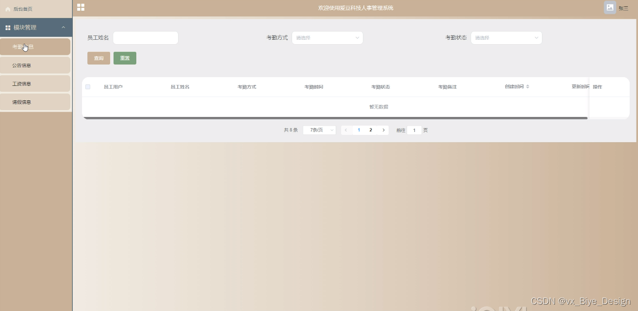 员工登录进入爱豆科技人事管理系统 可以查看首页、模块管理(考勤信息、公告消息、工资信息、请假信息)等功能。如图5-10所示。