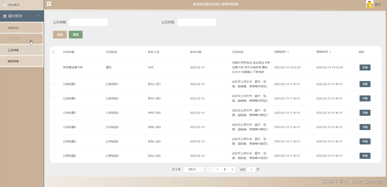 公告信息管理,在部门信息管理页面可以通过查看公告标题、公告标签发布人员、发布日期、公告内容等详细信息,进行查看详情如图5-11所示。