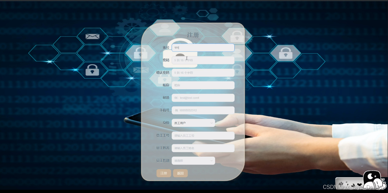 管理员注册,通过输入账户、密码、确认密码、昵称、邮箱、手机号、身份、员工工号、员工姓名、员工性别等信息进行注册 ,如图5-1所示。