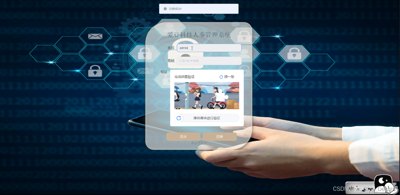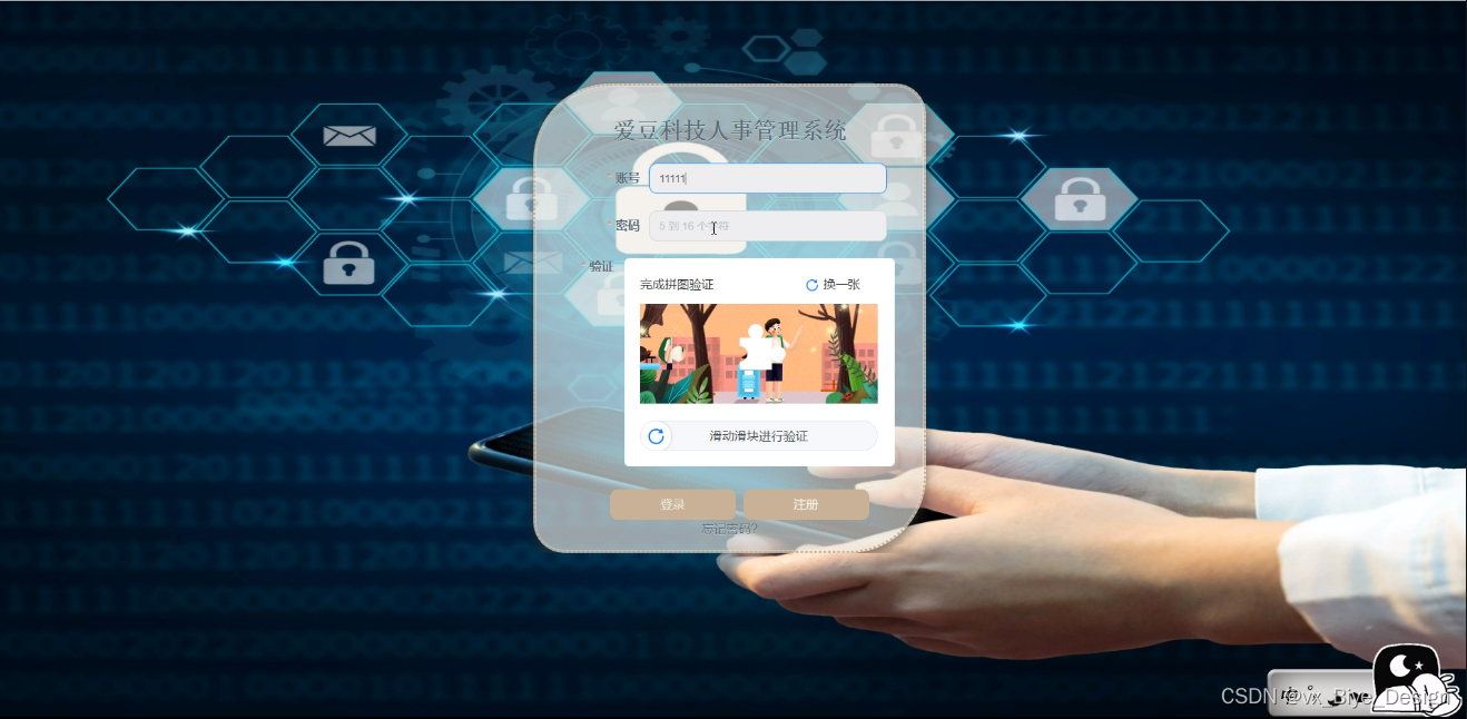 员工登录,员工通过输入用户名,密码,滑动滑块进行验证登录爱豆科技人事管理系统 ,如图5-9所示。