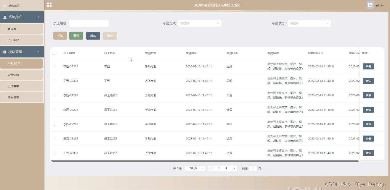 考勤信息管理,在考勤信息管理页面可以查看员工用户、员工姓名、考勤方式、考勤时间、考勤状态、考勤备注等内容,并可根据需要进行修改,删除或查看详细内容等操作,如图5-7所示。