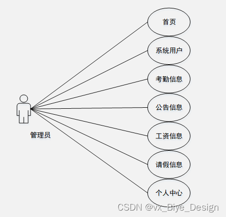 对于管理员可以使用的功能模块主要有首页、系统用户(管理员、员工用户)、模块管理(考勤信息、公告信息、工资信息、请假信息)等功能。