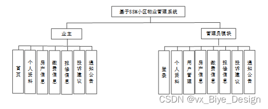 系统的整体架构确定以后,再来看小区物业管理系统的主要功能模块图。整体的功能模块包括管理员+业主用户两个模块,实现的模块主要有用户管理、房产信息、缴费信息、报修信息、投诉建议、通知公告等。