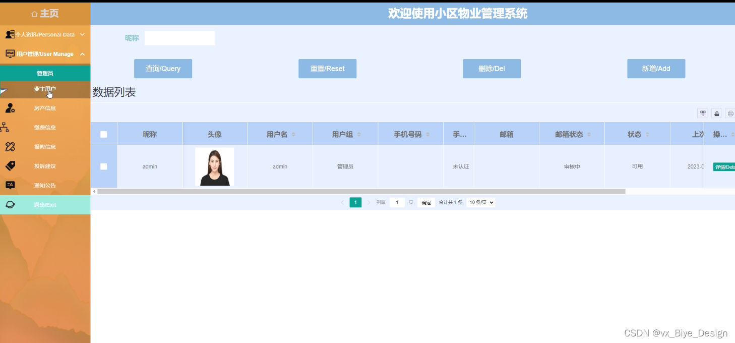 用户管理模块包含了管理员,业主用户两个部分,管理员可以查看到业主的信息,但是只有管理员可以对业主进行增删改查操作,界面如下图4.11所示。